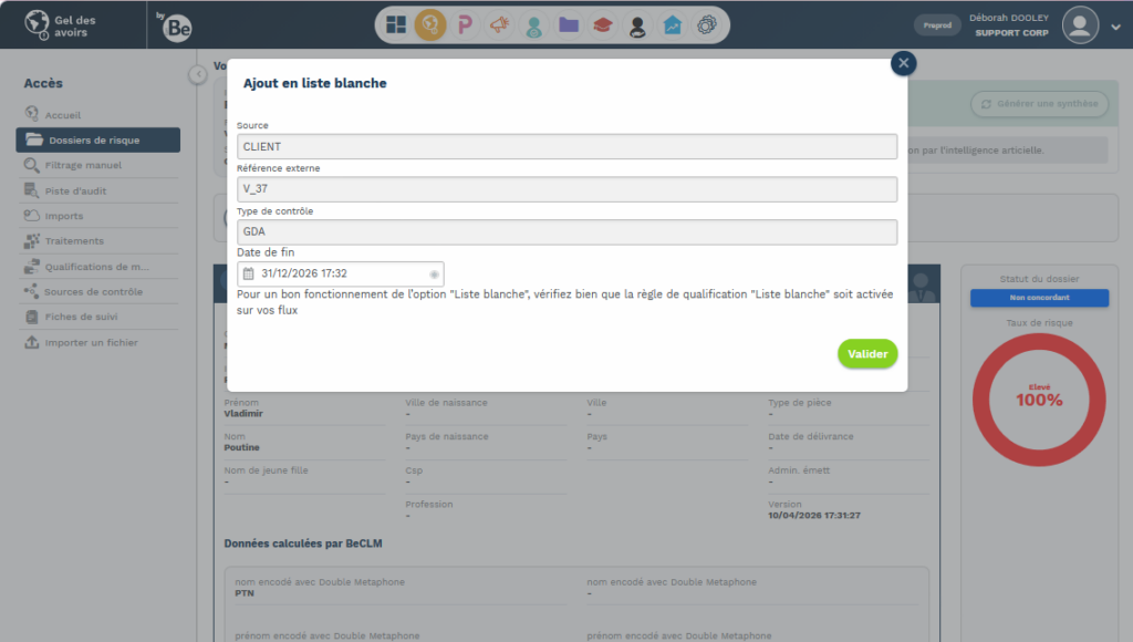 Ces règles s’appliquent aux personnes physiques (PP) et morales (PM), sur les listes de sanctions GDA et les listes PPE.Chaque qualification en NON CONCORDANT génère automatiquement un commentaire explicatif intégré au dossier de risque.
