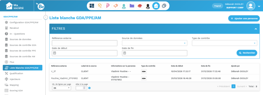 - Si vous êtes administrateur > module société > liste blanche GDA PPE Adverse Médias